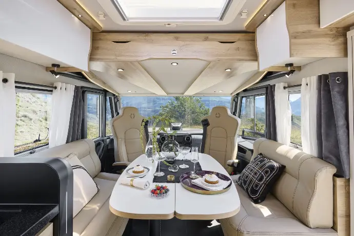 Een van de meest doorslaggevende troeven van Le Voyageur is de uitzonderlijke bouwkwaliteit. Deze motorhomes worden niet ontwikkeld met snelle productie als doel, maar met langdurig en intensief gebruik in gedachten. De constructie is stevig, doordacht en perfect afgestemd op stabiliteit, wat zich onmiddellijk vertaalt in een bijzonder comfortabele rijervaring. Ook op lange afstanden of minder ideale wegen blijft het voertuig rustig en solide aanvoelen. Die kwaliteit stopt niet wanneer je stil staat. De meubels zijn robuust en zorgvuldig afgewerkt, de deuren sluiten perfect en alles voelt betrouwbaar en duurzaam aan. Dit is het soort kwaliteit dat je niet alleen ziet, maar vooral voelt na jaren gebruik. Precies daarom behoudt een Le Voyageur zijn waarde en reputatie binnen het luxesegment.
