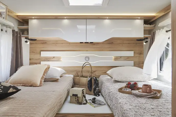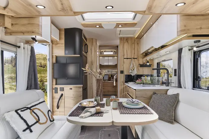 Le Voyageur staat bekend om zijn sterk uitgewerkte interieurarchitectuur. Elk model is ontworpen om een gevoel van ruimte, harmonie en sereniteit te creëren. De indelingen zijn logisch en functioneel opgebouwd, waardoor elke vierkante meter optimaal benut wordt zonder dat het interieur druk of overweldigend aanvoelt. De leefruimtes nodigen uit om te ontspannen, terwijl slaap- en badkamers echte privacy bieden. Wat Le Voyageur onderscheidt, is de manier waarop luxe wordt benaderd. Geen overdaad of modieuze hoogglans, maar warme materialen, zachte kleuren en een natuurlijke samenhang tussen alle elementen. Het interieur is ontworpen om jarenlang aangenaam in te leven en dat maakt het merk uniek binnen het premiumsegment.